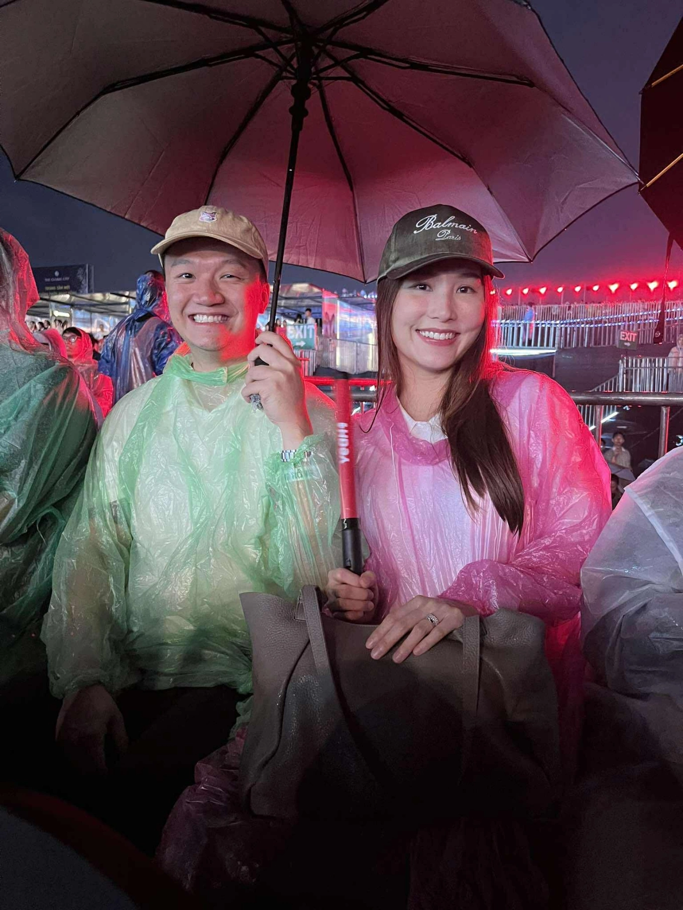 (Photo: Actress Diem My 9x and her husband waiting in raincoats for the concert to begin. Credit: Hoang Dung)