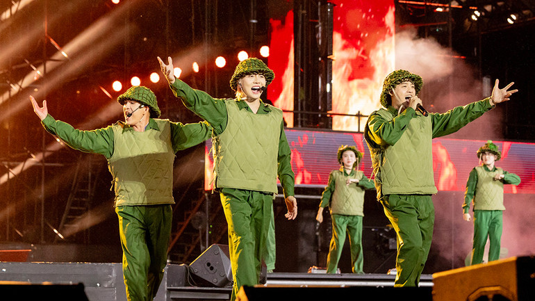 Phương Mỹ Chi và Double 2T thể hiện ca khúc “Mùa Xuân Trên Thành Phố Hồ Chí Minh” tại lễ kỷ niệm. (Ảnh: DUY LINH)